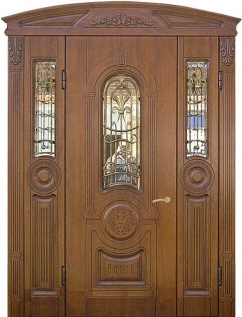 Поскольку в большинстве случаев устанавливаемые на входе в коттедж двустворчатые двери являются еще и предметом интерьера, украшающим здание, их дизайну предается особое значение. Эти двери, как правило, отделываются атмосферостойким МДФ, натуральным шпоном, массивом. Эффектно на таких дверях смотрится витражный узор, применение ковки, зеркальных элементов. Вариантов декора входной двустворчатой двери масса, тут все зависит от пожеланий заказчика.
